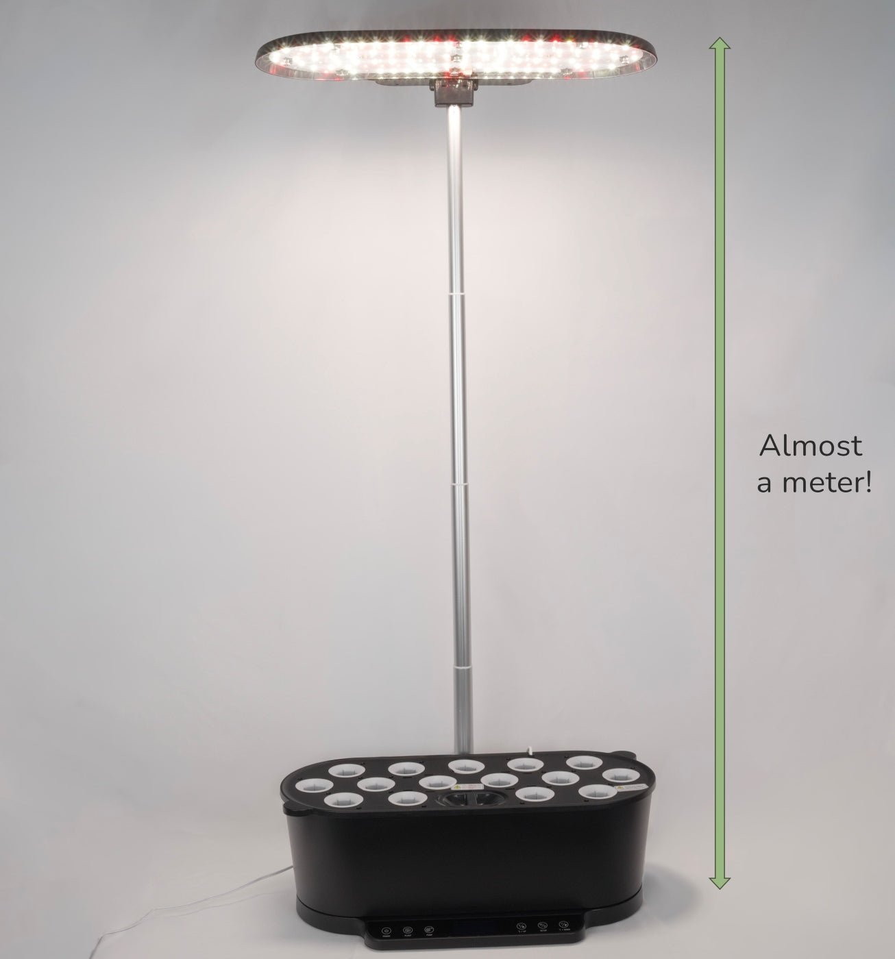 The grow light can be height-adjusted to nearly a full metre from the base, providing all the vertical space your plants could ever need!Â